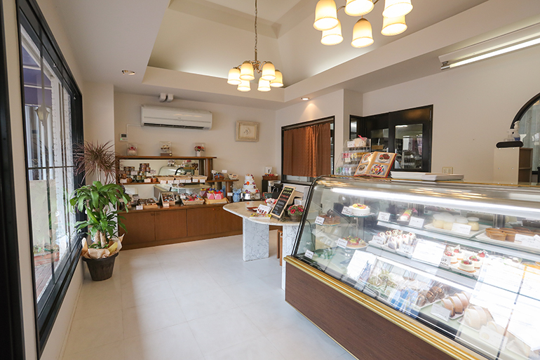 明るいオシャレな雰囲気の店内で、色とりどりのケーキがショーケースの中に処狭しと並んでいます。 焼き菓子コーナーもあり、 ちょっとした手土産やギフトに買われるお客様も多いです。